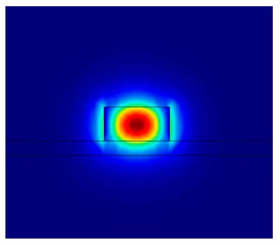 Simulations for designing the dimensions of the waveguide and the grating coupler where carried out using COMSOL-Multiphysics. The dimensions of the waveguide were designed for single-mode wave propagation and a typical calculated mode profile for a strip waveguide on a silicon nitride membrane is shown in Figure 2. Different thicknesses of the silicon nitride membrane were tested.