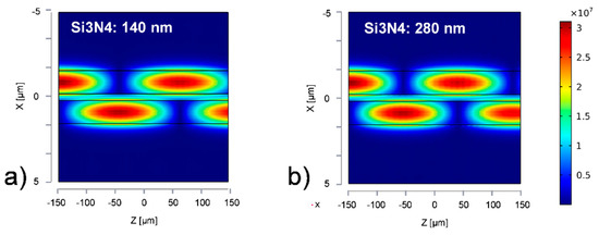 (a,b) Representative simulation results for directional coupler structures with a thickness of the Si3N4 layer as indicated in the graph. The wavelength is 4.26 µm. The gap between the waveguides was 400 nm. The amplitude of the electric field is plotted. Optical parameters were taken from the COMSOL data base according to literature.