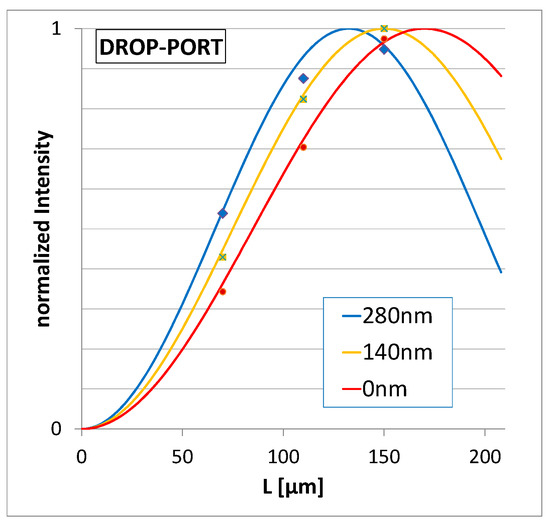 Comparison of simulation with experimental results. The curves show the simulated relative intensities at the through-port as a function of propagation length for three different layer-thicknesses of Si3N4. The markers show the experimental results measured on structures with interaction lengths of 70, 110, and 150 µm and different thickness of the Si3N4 layer. The values for the refractive indices of Si and Si3N4 used in the simulations, were nSi = 3.53 and nSi3N4 = 1.92 respectively.
