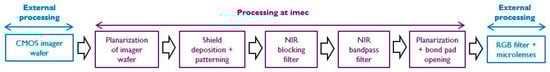 Recent developments in multispectral cameras have demonstrated how compact and low-cost spectral sensors can be made by monolithically integrating filters on top of commercially available image sensors. In this paper, the fabrication of a RGB + NIR variation to such a single-chip imaging system is described, including the integration of a metallic shield to minimize crosstalk, and two interference filters: a NIR blocking filter, and a NIR bandpass filter. This is then combined with standard polymer based RGB colour filters. Fabrication of this chip is done in imec’s 200 mm cleanroom using standard CMOS technology, except for the addition of RGB colour filters and microlenses, which is outsourced.