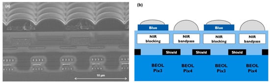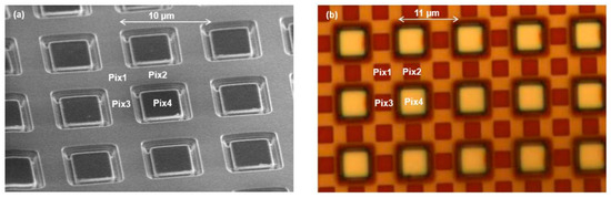 Out of every four pixels, three are dedicated to visible light, and one to NIR (815 nm narrowband), as shown schematically in Figure 3. The distinction between red, green, and blue is made at the end of the processing, using traditional polymeric colour filters. Since these colour filters have leakage in the NIR range, leading to colour degradation, the first three pixels are covered by a NIR blocking filter, only allowing visible light to pass. The fourth pixel is covered by a NIR bandpass filter with 815 nm as central wavelength. Both interference filters are realized by deposition of dielectric multilayer stacks, followed by pixel level fine lithography, dry etch and photoresist strip; hence, classical CMOS compatible patterning techniques. Top view SEM and microscope images after processing the NIR blocking and bandpass filters are shown in Figure 4.