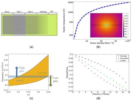 Filter 1, with 𝑟/𝑎 = 0.45, is considered to be doped Poly-Si with a concentration of 1 × 1020 cm−3 to serve both as the emitter and filter. In other words, the birth place of the thermally generated photons is a lattice which suppresses the emission of those photons with an energy lying within their band gap. Based on the gap map of Figure 1c, filter 1 acts as a low pass filter in our working window, and suppresses photon of a normalized energy higher than 𝜔𝑎/2𝜋𝑐 = 0.295. Being conductive, filter 1 carries an electric current in order to heat the region up to relatively high temperatures. The high temperature of this region is shown in Figure 1b as a function of input electric power density, induces Planck’s black body radiation. Since the generation of these photons occurs in the filters 1, no photon with energy within the corresponding bandgap has the chance of propagating in the crystal. As a result, the emission from such structure is already selectively filtered around the working frequency band. The second filter, with 𝑟/𝑎 = 0.3, acts as a high pass filter within our working area and blocks the propagation of the photons with a normalized energy lower than 𝜔𝑎/2𝜋𝑐 = 0.27. The mirror region, with 𝑟/𝑎= 0.35, has a band gap covering our frequency of interest, and therefore, it reflects back the photons of the energy 0.286 < 𝜔𝑎/2𝜋𝑐 < 0.296 travelling in (-x) direction into the guiding area. Finally, the matching section provides an adiabatic change of the PhC mode to the slab mode reducing unwanted reflection due to momentum mismatch. The center of the holes of the adiabatic region has been considered to follow the position of a lattice with a constant of the one for filter 2, while the radii of its hole would decrease following the below formula: