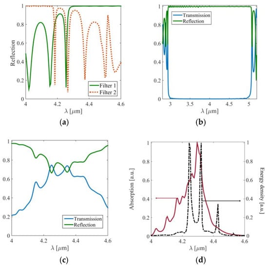 To model the emittance of PhC emitter we use Kirchoff’s law, stating that emittance and absorptance are equivalent [13]. The reflection and/or transmission spectra of each individual parts of the system are shown in Figure 2a–c. For the simulation, a TM mode is first excited in a slab and its reflection and transmission were recorded. The structures were terminated with a perfect matching layer (PML) in order to prevent unwanted reflections. Figure 2a shows the reflection from the filter1 and 2. The narrow wavelength range with low reflection for both filters corresponds to the emittance wavelength range of the emitter. Figure 2b shows a close to 100% reflection of the mirror throughout our working wavelength window. Figure 2c shows that almost 80% intensity of the light produced in the emitter passes through matching layer and is converted to slab mode.