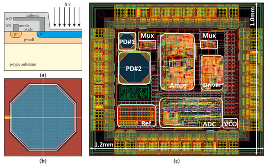 Universal Integrated Photodetector Platform: (a) photodiode cross section, (b) photodiode layout and (c) complete chip layout with highlighted functional blocks.