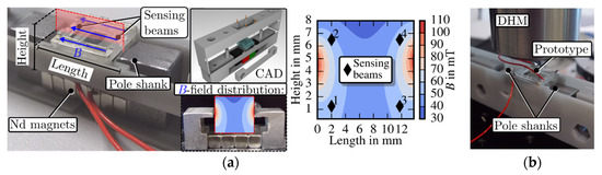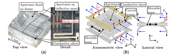 Figure 2a depicts the measurement setup and field distribution which the prototype’s beams experience between two pole shanks, connected with neodymium magnets. The magnetometer was placed within a cavity of a 3D-printed custom made mounting device. Two pole shanks, connected with neodymium magnets introduced a horizontal magnetic field. Nevertheless, geometry and rather large distance of the pole shanks yields a diverging field distribution which was characterised with a Hall probe. The approximate field strength which the beams experience was obtained from that measurement. An LED and four spring probe pins were integrated at the top part of the mounting device, whereas a photodetector was placed below the prototype and magnets at the bottom part. A Keithley current source model 6221 provided an alternating current via the spring probe pins to the prototype’s beams and, hence, induced out-of-plane deflection. These oscillations were converted into an in-plane movement of the mass by the curved beams, thus enabling light flux modulation. This modulated light was detected by a photodiode, the output signal amplified with a transimpedance amplifier and acquired with a lock-in amplifier (SR830).