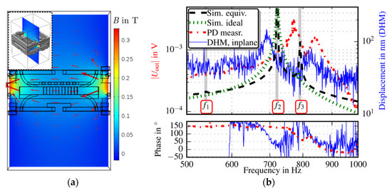 f3) is superimposed with an in-plane oscillation and thus appears more pronounced within a heterogeneous magnetic field. This enables a detectable modulated light flux with the optoelectronics and in-plane displacement measurements with the DHM. The equivalent simulated and measured transfer function exhibit a similar shape but differ in frequency of the observed modes.