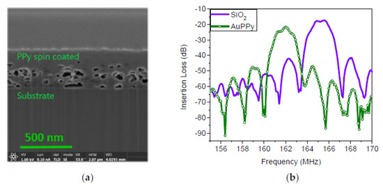 After spin coating of the PPy and AuPPy NPs (i.e., the second guiding layer) on the LW transducing platforms, the films displayed a porous morphology as can be noticed in the cross-section shown in Figure 2a. Moreover, Figure 2b shows an example of the Insertion Loss (−21 dB) and frequency (162 MHz) measured in the LW sensors tested in this work.