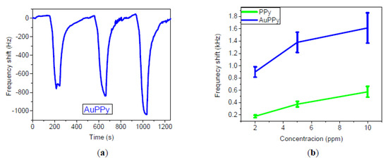 In general, the sensors based on the Au modified PPy demonstrated enhanced sensing properties towards NH3 compared to the sensors based on non-modified PPy. We further observed that the sensors based on lower Au loadings (i.e., 1:10) provided better responses compared to those based on higher Au loadings (i.e., 1:2). Namely, AuPPy (1:10) sensors showed frequency shifts in kHz and an increase in the response of 20, 27 and 36% to 2, 5 and 10 ppm, respectively, as compared to PPy sensors. The response (frequency shift) of LW sensors based on AuPPy (1:10) to 2 ppm of NH3 is shown in Figure 3a, whereas a comparison of the calibration curves of both sensors based on PPy and AuPPy (1:10) towards NH3 is presented in Figure 3b. The response times for the sensors (i.e., based on PPy and AuPPy) were below 60 s.