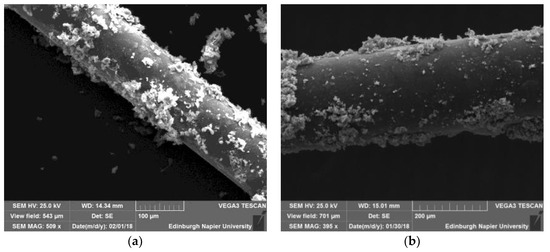 Coating of hydrogel on fibre could be challenging due to poor bonding between the polymer and the glass surface, thus increasing the surface area by increasing the roughness of the surface to have better wettability. In this study, both processes of deposition of GO had been investigated, followed by the coating of the hydrogel. It could be seen that a non-uniform and non-continuous coating for both the two methods of deposition had been achieved, increasing the surface roughness, as shown in Figure 1. The electrostatic coating given by the evaporation had less bonding strength between the particles and the optic fibre, as shown in Figure 1a. The hydrogel was then applied as discussed in Section 2.1.3.