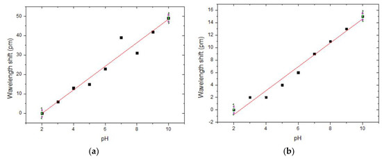 It should be noted while producing the sensor for biological applications, that hydrogel degrades under different mechanisms depending on pH. When it is subjected to pH above 10.0, it decomposes because of β-elimination mechanisms. Below pH 5.0 acid-catalysed hydrolysis causes hydrogel degradation [16]. For this reason, the system was immersed for 2 min in different pH solutions. There was a correspondence between the variation in pH and the respective variation in the FBG resonance wavelength for both GO deposition methods at room temperature, as depicted in Figure 2. There was a dramatic difference in sensitivity across the two methods. The evaporated GO with the hydrogel having a sensitivity of (6.1 ± 0.5) pm/pH whereas the co-electrodeposited GO with the hydrogel has a relatively less sensitivity of (1.9 ± 0.1) pm/pH. Even though the sensitivity is higher in the first case, the coating was not strongly bonded to the fibre. In the second method, even though with less sensitivity, the overall performance was higher in terms of strong bonding to the optic fibre due to the strongly attached GO particles.