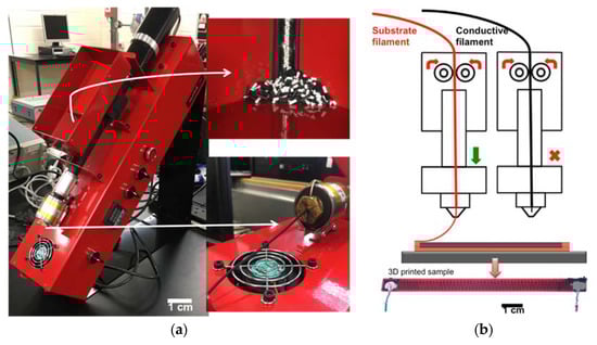 (a) Preparation of the sensing material via single-screw extruder (inset of mixed pellets and the extruded 1.75 mm strand); (b) The schematic process of 3D FDM dual printing.