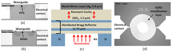 The VERD consists of alternated Si/SiO2 layers with a structured metallization layer on top (Figure 1c,d). The fabrication and optimization details are provided elsewhere [9]. Briefly, the structure function is analogous to that of a Fabry-Perot resonator, with a SiO2 cavity, whose thickness determines the central operating frequency, and a thin layer stack of Si and SiO2 beneath it, forming a distributed Bragg reflector. Being highly reflective and slightly absorptive, the metal layer (Figure 1d) functions simultaneously as the second mirror of the Fabry-Perot resonator and as a detector. In contrast to the RTD and the diode, the VERD structure works as a narrowband detector whose central frequency and bandwidth are determined by the cavity thickness and the distributed Bragg reflector (i.e., design parameter). The VERD is thermally decoupled from the substrate via a backside etch and the change in temperature of the metal layer due to absorption of the mid-infrared radiation is read out resistively.