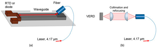 Schematic view of the experimental setup for characterization of (a) the integrated RTD and diode structures in front of a waveguide and (b) the VERD structure.