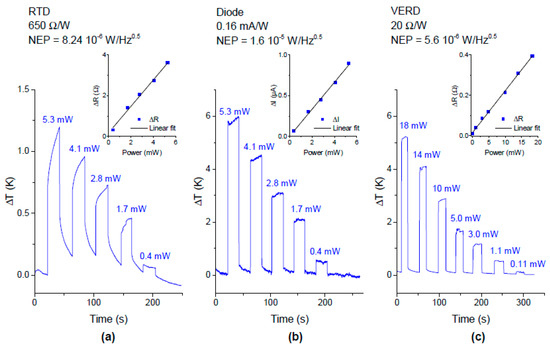 Temperature change of the three detectors illuminated by mid-infrared light at 4.17 µm. (a) RTD, (b) diode and (c) VERD. The experimentally determined responsivity and noise-equivalent power (NEP), including the current readout noise of our instrument, is indicated in each panel. The detectivity is expected to improve significantly by on-chip readout due to a reduction of the noise level.