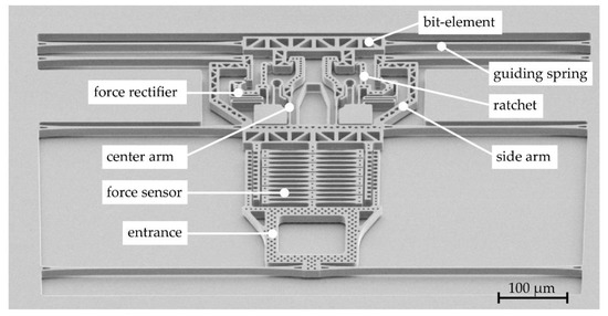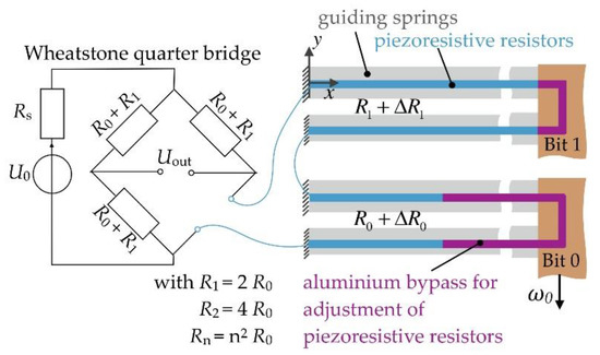 The working principle of the cross-domain DAC is illustrated in Figure 3. Piezoresistive strain gauges with different resistance values are used as transducers. The strain gauges are positioned at the guiding springs of each bit. Depending on the bit-state, the correlating strain gauge can be either strained or relaxed.