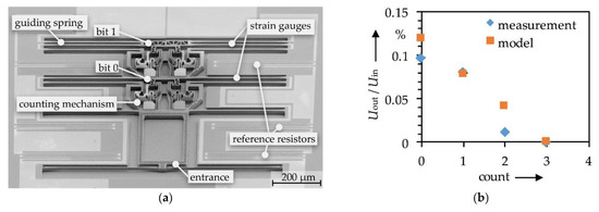 Figure 4b shows the measured digital-to-analog conversion without amplification. The modelled values are obtained from Equations (2) and (3), assuming a deformation of εt = 0.03% and a basic resistance of R0 = 196 kΩ. The variation shown between the model and the measurement results at count 0 and 2 are assumed to be based on a variation of the total strain at the guiding springs of bit 0 and bit 1.
