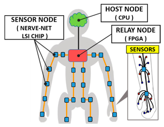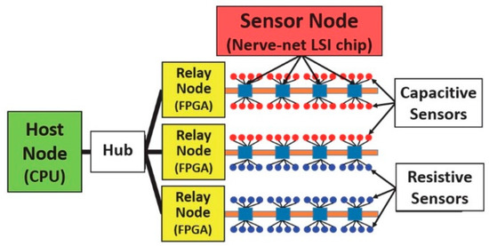 The nerve-net sensing system consists of three levels of host nodes, relay nodes, and sensor nodes (Figure 2). A CPU, an FPGA (Field Programmable Gate Array) and a nerve-net LSI chip works as the host node, the relay node, and the sensor node, respectively. The CPU and FPGAs are connected with a hub and USB cables, FPGAs and LSIs are connected by special bus lines. The bus lines consist of four lines: 3.3 V, 1.2 V power lines, ground and signal lines. A plurality of capacitive type and resistance type sensors can be connected to one of the nerve-net LSI chip serving as the sensor node. Analog signals from the sensors are digitized and outputted to the bus line. It is possible to arrange many sensors on the bus lines. Since the bus line becomes a belt-like shape, sensors are easily mounting and wiring on curved surfaces of robots. Up to 255 sensor nodes can be connected on a bus line corresponding to one relay node and up to 127 relay nodes can be connected to the host node. As this system as a whole, 255 × 127 = 32,385, that is, about 30,000 sensor nodes are connected and designed to be managed by the host node.