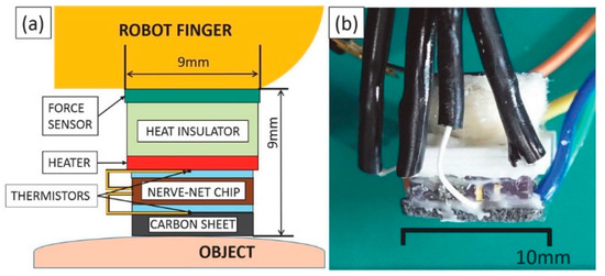 - Iwase, T.; Takamuku, S.; Hosoda, K. Discriminating Materials by an Anthoropomorphic Soft Finger with Tactile and Thermal receptors. In Proceedings of the 2008 JSME Conference on Robotics and Mechatronics, Nagoya, Japan, 5–7 June 2008; pp. 1–4. [Google Scholar]