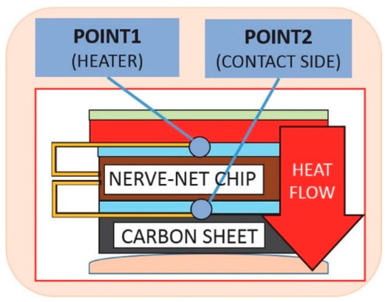 Using the nerve-net sensing system, we proposed a sensor head which simultaneously measures force and thermal quantities. The sensor head has two parts. One is a thermal sensing part, which is close to the contact target and has a heater. Another is a force sensing part, which is set in a portion far from the contact surface. The sensor head consists of a resistance type force sensor, a heat insulator, a heater, a nerve-net LSI chip, two thermistors and a carbon sheet (Figure 3). The size of the sensor head is 9 × 9 × 9 mm3 and it can be attached to a fingertip of robot fingers. Applied forces are detected by the force sensor. Temperatures are detected by thermistors. Heat flow rates are obtained from the temperature difference between the two points of Point1 and Point2 (Figure 4). The nerve-net LSI chip has two roles. The first is to collect sensor data of two temperatures by two thermistors and a force by the force sensor. The second is to create a temperature difference as a thermal resistor. The nerve-net LSI chip is packaged in a ceramic of good heat transfer coefficient. The heater is used to actively generate a temperature difference between the sensor head and the object to be measured. The face of the sensor head is covered with a soft and high thermal conductivity carbon sheet to prevent injury to an object and to make good contact with one.