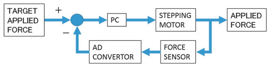 By stabilizing the contact state between the sensor head and the object, we can stably measure the heat flow rate. A sensor stick was made to control applied force in heat flow measurement. The sensor stick consists of a sensor head, an actuator, and a supporting stand (Figure 5). The sensor stick size is 60 × 100 × 150 mm3. The sensor stick performs feedback force control with force data obtained from the sensor head through an AD converter. In the proportional feedback control, the stepping motor movement is divided in seven stages by a deviation between the target applied force and the applied one (Figure 6).