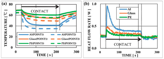 Three objects with different thermal conductivities of PE (polyethylene), glass and Al (aluminum) blocks were used to measure the heat flows by the sensor stick. The thermal conductivities of PE, glass and Al are 0.4, 1.0, 240 W/m·K, respectively. The block sizes were 40 × 50 × 20 mm3 for PE and Al, and 70 × 70 × 17 mm3 for glass (Table 1). In the measurement, the sensor head was kept high temperature by heating of 0.55 W. After the temperature of the sensor head up to 65~70 °C, the sensor head was brought into contact with the object for 180 s by the actuator. At the time of contact, the actuator maintained a constant contact force at 3.0 ± 0.2 N.