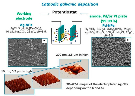 The nanostructures are formed with a tuned morphology and functionality for further sensing applications (shown for nanoparticles of silver (Ag-NPs) and palladium (Pd-NPs) produced at Ik = 10 mA/dm2 and tel = 30 s).