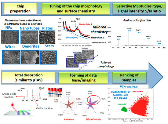 Remarkably, the nature of the ionization/desorption process and the type of generated ion species strongly depends on the functional groups present on the chip surface. Therefore, selective MS studies for particular class/fraction of bioanalytes are crucial. On the next step, total desorption/ionization of the provided clinical samples, in the manner similar to µTAS approach, is requested. This approach allows fractionation of loaded/spotted samples (max of 5–6 µL in volume) directly onto the electroplated chips followed by an accurate MS analysis. Finally, by means of chemometrics the total cellular biochemical profiles between reference/known and affected samples (cellular stress) can be compared and therefore, the unknown probes can be readily ranked with respect to the biological response.