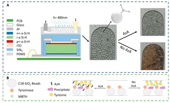 Experimental setup used for the detection of AzA. (A) a-Si:H photodiodes (schematic not to scale) are aligned with a PDMS microcolumn packed with APTESfunctionalized SiO2 beads. The micrographs on the right side of the figure illustrate the optical difference between a contaminated and non-contaminated sample; (B) Representation of the reaction mechanism used as a chemical transducer for AzA detection. In a first step, tyrosine is oxidized to a quinone which then reacts with MBTH to produce a colored pigment which is captured by the beads. AzA acts as an enzymatic inhibitor.