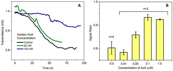 (A) Measurement of the microcolumn transmittance acquired in real time by the thin-film silicon photodiodes. The transmission values are presented as a ratio between the current at each time point and the initial value of measurement before introducing the sample; (B) Average value for endpoint measurements presented as the ratio between the final and initial current measured by the photodetector. Currently, the limit of detection of AzA in buffer in this system is approximately 50 nM.