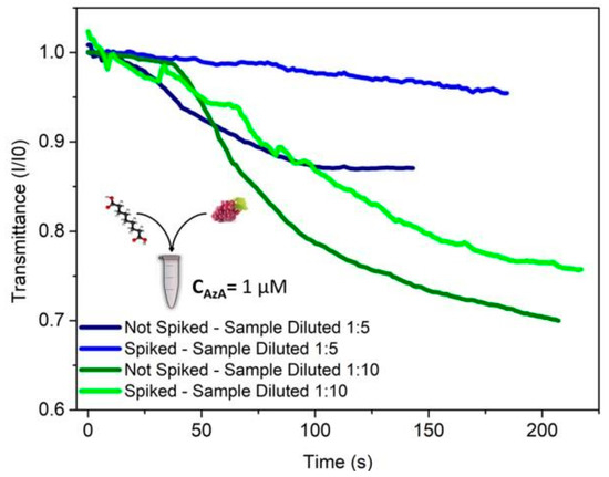 Once the microfluidic AzA detection operating conditions have been established, the next step was to try to detect the presence of AzA in a more realistic situation. Due to the fact that grapes have high quantities of phenols in both their pulp and their skin, some degree of sample pre-treatment was necessary, otherwise the free phenols in the grape juice will also react in a similar fashion to the tyrosine used as a substrate. After grinding the grapes using a mortar and pestle, the pulp was centrifuged at 2000 G for 15 min. The resulting supernatant was then retrieved, spiked with 1 µM of AzA and then diluted according to the desired experimental conditions.