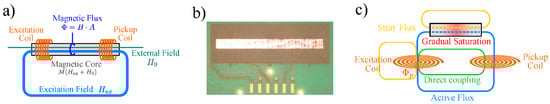 Such assumptions can be realistic when dealing with 3D setups and toroidal cores with homogeneously wound coils [8]. In true planar setups, however, this is not the case. Typically, such fluxgates are made up of adjacent (multilayer) spiral coils while the core is a thin stripe on top [5,6]. An example is shown in Figure 1b where a PCB based planar structure, similar to the one studied in [7], is depicted. When modeling such planar geometries the coupling between excitation and pickup coils becomes more complicated. The idea is that the total flux Φtot generated by the excitation coil and the magnetized core splits up into three parts Φfg, Φs and Φdc that must all be treated separately: