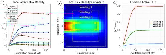 Equation (5) demonstrates that the fluxgate effect in a Vacquier-setup is, in principle, very stable. However, the sensitivity strongly depends on the system geometry through how efficiently active flux is generated and the core is saturated. The actual quantity of interest, and the only remainder in Equation (5), is the part of the active flux that is generated by the magnetic core. For any specific setup it can be modeled by a magnetostatic FEM simulation. In Figure 2 we show FEM simulation results (ANSYS Maxwell) for a realistic setup similar to the one depicted in Figure 1b with core dimensions of 10 × 1 × 0.1 mm3. The excitation coil is homogenized with dimensions of 5.2 × 4.2 × 0.1 mm3 directly and symmetrically placed below the core. The core material parameters are µr = 1000 and BS = 0.5 T using a simple atan-model for the magnetization. The magnetic flux density generated by core is obtained by subtracting simulation results with and without core from each other. For positions within the pickup region (adjacent coil in Figure 1b), Figure 2a demonstrates how the (local) active flux density behaves as a function of the excitation current. The saturation point at 50 AT is clearly visible. The sensitivity of the devise is proportional to the sharpness of this bend which is given by the maximum of the curvature. The latter is shown in the pickup region in Figure 2b. Regions in the direct vicinity of the core and close to the excitation coil (small values of y) contribute most to the fluxgate effect. The effective, active flux for three winding layouts is shown in c).