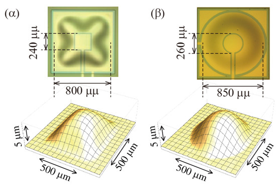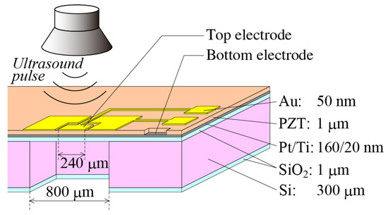 - Yamashita, K.; Shiomi, J.; Nishiumi, T.; Noda, M. Stress control on sol-gel PZT prepared for highly sensitive diaphragm structures of ultrasonic microsensors. In Proceedings of the 2016 Joint IEEE International Symposium on the Applications of Ferroelectrics, European Conference on Application of Polar Dielectrics, and Piezoelectric Force Microscopy Workshop (ISAF/ECAPD/PFM), Darmstadt, Germany, 21–25 August 2016. [Google Scholar]