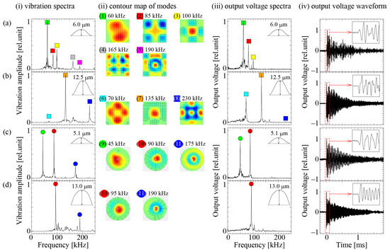 - Yamashita, K.; Nishiumi, T.; Tanaka, H.; Noda, M. Vibration modes in impulse response of piezoelectric diaphragms for ultrasonic microsensors. In Proceedings of the 2016 IEEE 11th Annual International Conference on Nano/Micro Engineered and Molecular Systems (NEMS), Sendai, Japan, 17–20 April 2016. [Google Scholar]