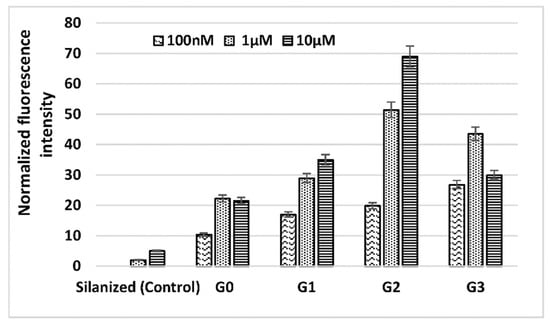 Recorded fluorescence intensity from three different concentrations of amino-modified aptamer against Ochratoxin A (tagged with Texas Red) immobilized onto silanized surfaces that have been functionalized with four generations of PAMAM dendrimers at a concentration of 1% v/v in methanol.