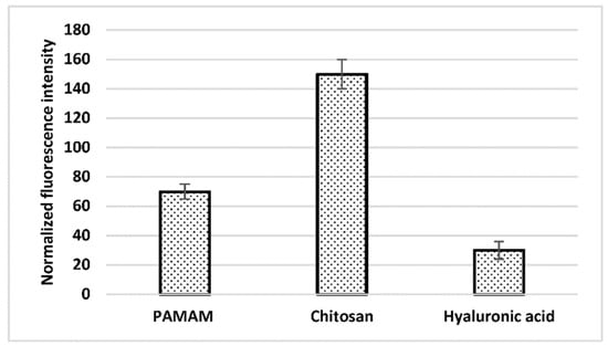 Recorded fluorescence intensity from 1μM aptamer against Ochratoxin A (tagged with Texas Red) immobilized onto silanized surfaces that have been functionalized with 1% PAMAM G2, 0.5% chitosan or 0.5% hyaluronic acid.