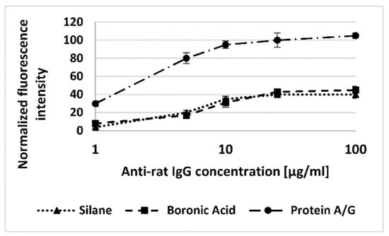 Analysis of the obtained fluorescence intensity results reveals that significantly higher amounts of antibody get immobilized onto the surfaces with the use of protein A/G in comparison to APBA-modified surfaces, whose loading capacity is comparable with that of unmodified, silanized surfaces (Figure 3).