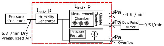 This system ensures that the air is precisely saturated at temperature tsat in the range of 5 °C to 70 °C. The dew point temperature of the air in the measurement chamber td is equal to tsat. Then the humid air from the humidity generator is heated to the temperature of the thermalized test chamber ttest, in which test sensors are located. These are in thermal equilibrium with the test chamber and the airflow. The temperature of the chamber ttest is referenced by PT-100 references. At the outlet of the test chamber, the airflow is controlled by a mass flow controller and is split into two channels: one channel passes a dew point hygrometer (MBW 373LHX) as the humidity reference, the other channel is the outlet.