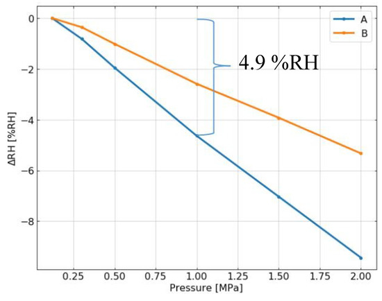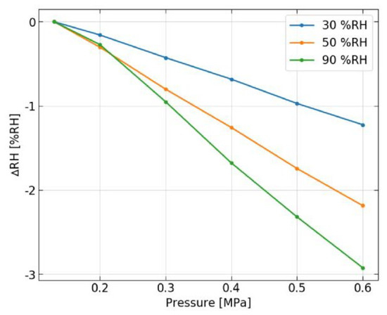 where Uref is the referenced relative humidity at ambient condition and p is pressure in MPa. The factor fSC is fixed to 1 for ambient pressure pa because the sensors are calibrated at ambient condition. Through further measurements at saturator temperatures of 13.9 and 6.25 °C, corresponding to 50 and 30%RH at 25 °C chamber temperature, respectively, we found that the effect scales with the relative humidity (see Figure 3). This is to be expected from a multiplicative factor on the effective saturation pressure. We can conclude that the factor fSC does not show a significant dependence on relative humidity in the limited range tested by this experiment.