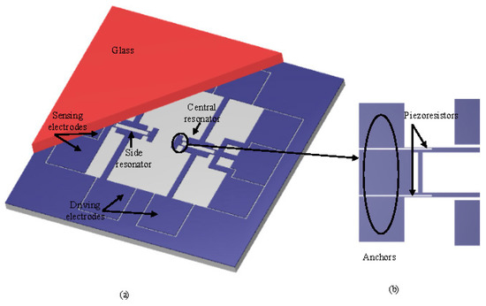 Figure 1a,b show the schematic of the resonant pressure sensor which mainly consists of a pressure-sensitive membrane, double resonators featured with double-ended tuning forks and several electrodes. The function of the pressure-sensitive membrane is to sense the outside pressure under measurement and transfer to the stress distributions of the resonators. The thickness of the pressure-sensitive membrane contributes reversely to the sensitivity of the sensor chip. Two resonators clamped on the membrane are positioned on the central and side areas of the membrane respectively, which are named as “central resonator” and “side resonator”. In individual resonator, double-ended tuning forks are used as resonators, which are driven to vibrate due to electrostatic forces generated by the driving electrodes and the resonant beams. The piezoresistors are positioned at the end of the resonant beams to sense the buildup of the stress.