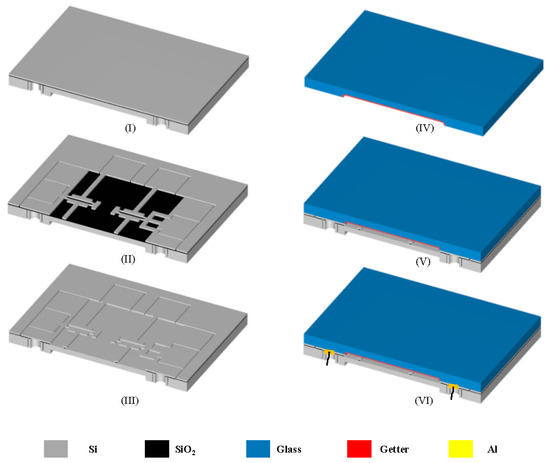 The fabrication flow chart of the proposed resonant pressure micro-sensor includes key steps of (I) formation of the pressure-sensitive membrane and through-silicon vias by DRIE; (II) patterning of the resonator by DRIE; (III) release of the resonator using an HF buffer; (IV) deposition of getter material on glass covers, (V) silicon-to-glass anodic bonding; (VI) formation of electrical connections.