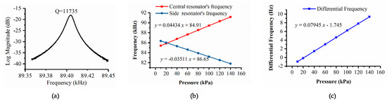(a) The open-loop result of a typical resonant pressure micro-sensor where the quality factor was quantified as 11735, validating the fabrication process, which can produce an environment of high vacuum for the resonators; (b) The closed-loop result of a resonant pressure micro-sensor where the resonant frequencies of the central and side resonator were observed to increase and decrease, respectively, in response to an increase in the pressure under measurement; (c) The differential output of the resonant pressure micro-sensor, producing a sensitivity of 79.45 Hz/kPa, a linearity less than 0.01%, and a detection range of 10–150 kPa.