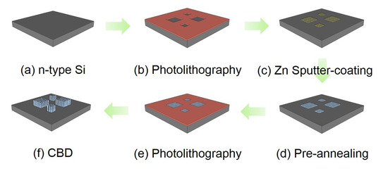 - The fabrication started from a piece of sample with a dimension of 30 × 30 mm2, the sample was cut from an n-type bulk-silicon wafer (crystal orientation: <100>; resistivity: 1–10 Ω × cm; thickness: 275 ± 15 µm and diameter: 100 ± 0.13 mm) and cleaned by putting the sample into a boiling acid mixture (H2O2 (30%) and H2SO4 (96%), v:v = 1:1) for 5 min.