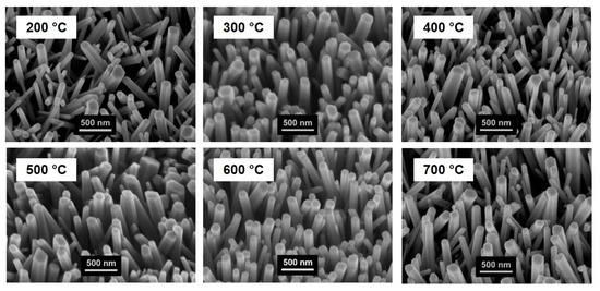 Inclined-view (30°) SEM graphs of ZnO NRs grown on S/A SLs at different pre-annealing temperatures from 200 °C to 700 °C.