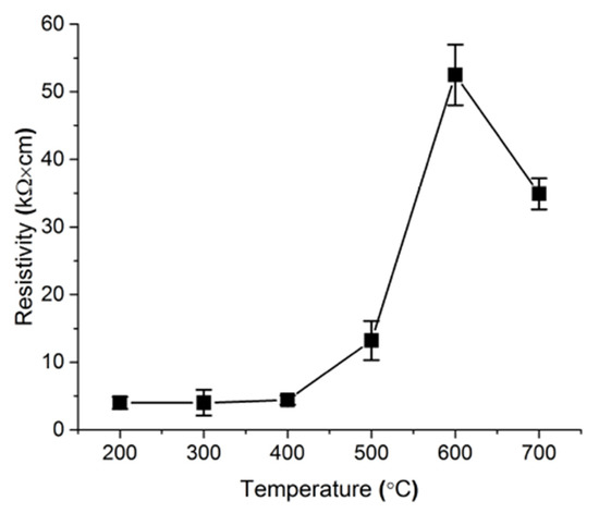 Resistivity of ZnO NRs array grown on a SL annealed at different temperatures.