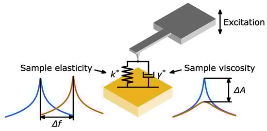 Schematic of the measurement principle with the tip-sample interaction modeled as a spring-damper element. The contact stiffness is related to the sample elasticity and mainly affects the resonance frequency while the dampening coefficient is related to the viscosity and mainly affects the resonance amplitude (inspired by [5]).