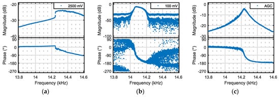 The goal of this work is to build a flexible measurement setup that can be adapted to evolving demands. For this reason, a software PLL (SPLL) based measurement system is used. The first version of the electronics (SPLL v1) tries to address the APLLs shortcomings: the phase detection range is expanded, the phase lock condition is made user controllable, the frequency range is broadened, and the sample rate is increased. However, as shown in Figure 3a, the excitation amplitude is too high and leads to nonlinear behavior of the frequency response [6,7]. It is therefore necessary to be able to control the applied excitation amplitude.