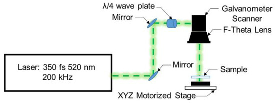 The employed laser for LLO process emits at a wavelength of 520 nm, a pulse length of 350 fs, and a repetition rate of 200 kHz for the optical system as seen in Figure 1. The micromachining system consists of a galvanometer scanner, with 100 mm focal length telecentric f-theta lens integrated with linear motorized XYZ positioning stage system, which can control the sample position and working distance between the objective and the workpiece. The laser beam polarization qualities were kept by a λ/4 wave plate in this optical system. In this experiment, InGaN/GaN LED epitaxial layers on 2″ sapphire substrates from epitaxy competence center (ec2) are used, consisting of 4.4 μm heavily doped n-GaN layer in the range of 1018–1019 cm−3, 4 pairs of InGaN/GaN multi quantum wells (MQWs) and p-GaN with a total thickness of approximately 300 nm. The LED epi-layers were grown by MOVPE on 420 μm thick, non-patterned, double-side polished sapphire substrates.