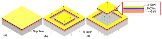 - Kim, J.; Kim, J.H.; Cho, S.H.; Whang, K.H. Selective lift-off of GaN light-emitting diode from a sapphire substrate using 266-nm diode-pumped solid-state laser irradiation. Appl. Phys. A Mater. Sci. Process. 2016, 122, 305. [Google Scholar] [CrossRef]