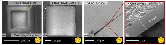 Concerning the experimental results, InGaN/GaN LED chips with a total area of 1 × 1 mm2 were successfully separated from the sapphire substrate in a reproducible process. Results from an LLO process of a free-standing GaN chip without transfer substrate and tape release are depicted in Figure 3.